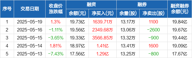 融资方面,当日融资买入7.31亿元,融资偿还7.14亿元,融资净买入1639.71万元,连续9日净买入累计9.08亿元。融券方面,融券卖出1100股,融券偿还0股,融券余量13.17万股,融券余额1148.35万元。融资融券余额合计19.84亿元。