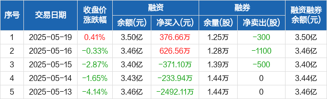 融资方面,当日融资买入1721.88万元,融资偿还1345.22万元,融资净买入376.66万元。融券方面,融券卖出0股,融券偿还300股,融券余量1.25万股,融券余额15.24万元。融资融券余额合计3.5亿元。
