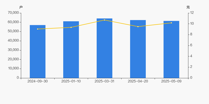 截至2025年5月9日,公司最新A股总股本为6.65亿股,其中流通股本为5.65亿股。户均持有流通股数量由上期的9057股上升至9192股,户均流通市值9.36万元。