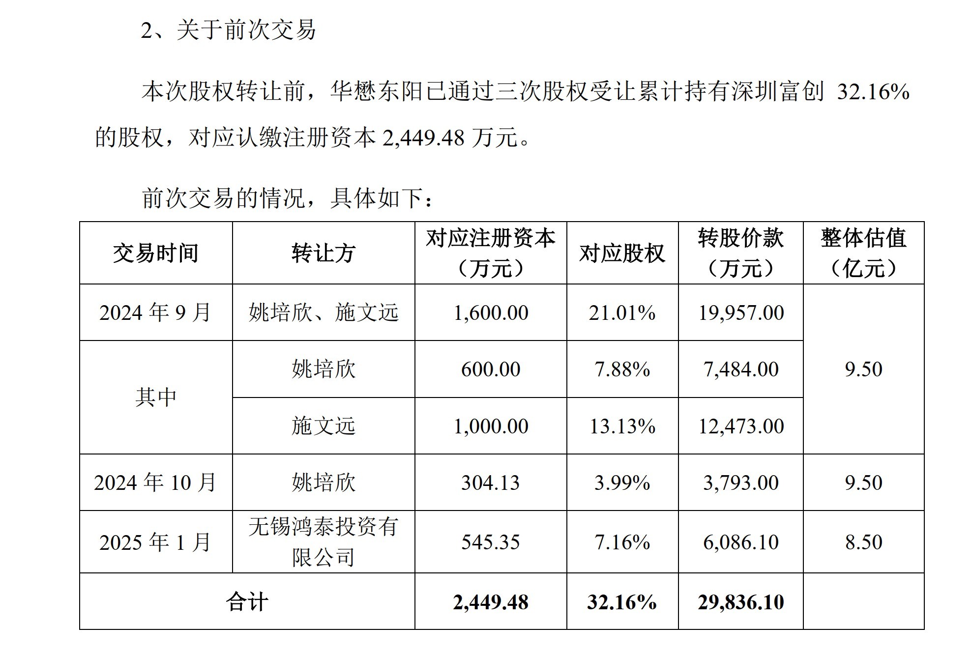 2024年9月、10月和今年1月,华懋东阳合计以约2.98亿元的价格,取得了富创优越32.16%股权。