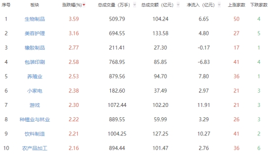 板块方面,生物制品、美容护理、橡胶制品等板块涨幅居前,港口航运、化学纤维、军工电子等板块跌幅居前。