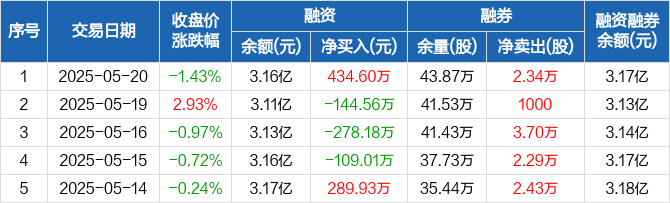 融资方面,当日融资买入1172.99万元,融资偿还738.39万元,融资净买入434.6万元。融券方面,融券卖出2.34万股,融券偿还0股,融券余量43.87万股,融券余额182.06万元。融资融券余额合计3.17亿元。