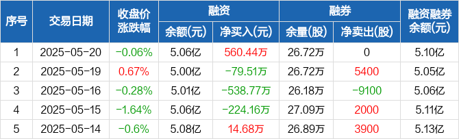 融资方面,当日融资买入1212.22万元,融资偿还651.78万元,融资净买入560.44万元。融券方面,融券卖出0股,融券偿还0股,融券余量26.72万股,融券余额483.63万元。融资融券余额合计5.1亿元。