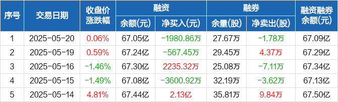 融资方面,当日融资买入3598.23万元,融资偿还5579.09万元,融资净偿还1980.86万元。融券方面,融券卖出2000股,融券偿还1.98万股,融券余量27.67万股,融券余额471.5万元。融资融券余额合计67.09亿元。