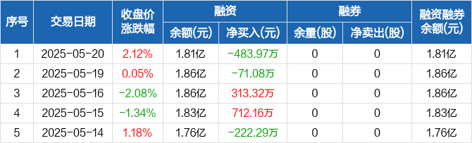 融资方面,当日融资买入1448.54万元,融资偿还1932.51万元,融资净偿还483.97万元。融券方面,融券卖出0股,融券偿还0股,融券余量0股,融券余额0元。融资融券余额合计1.81亿元。
