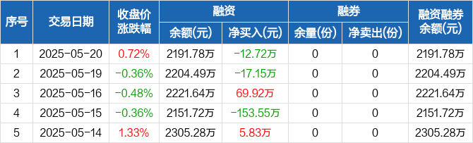 融资方面,当日融资买入80.9万元,融资偿还93.62万元,融资净偿还12.72万元。融券方面,融券卖出0份,融券偿还0份,融券余量0份,融券余额0元。融资融券余额合计2191.78万元。