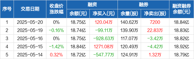 融资方面,当日融资买入2734.41万元,融资偿还2614.37万元,融资净买入120.04万元。融券方面,融券卖出2.66万股,融券偿还1.94万股,融券余量140.62万股,融券余额876.03万元。融资融券余额合计18.84亿元。