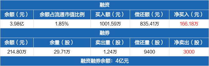 融资方面,当日融资买入1001.59万元,融资偿还835.41万元,融资净买入166.18万元。融券方面,融券卖出1.24万股,融券偿还9400股,融券余量29.71万股,融券余额214.8万元。融资融券余额合计4亿元。