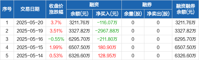 融资方面,当日融资买入444.1万元,融资偿还560.16万元,融资净偿还116.07万元,连续3日净偿还累计3295.75万元。融券方面,融券卖出0股,融券偿还0股,融券余量0股,融券余额0元。融资融券余额合计3211.76万元。