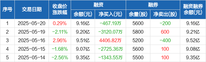 融资方面,当日融资买入8235.22万元,融资偿还8702.42万元,融资净偿还467.19万元。融券方面,融券卖出1400股,融券偿还1600股,融券余量5600股,融券余额82.92万元。融资融券余额合计9.16亿元。