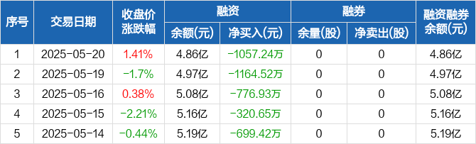 融资方面,当日融资买入3647.05万元,融资偿还4704.29万元,融资净偿还1057.24万元,连续6日净偿还累计4270.75万元。融券方面,融券卖出0股,融券偿还0股,融券余量0股,融券余额0元。融资融券余额合计4.86亿元。