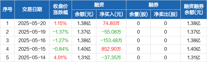 融资方面,当日融资买入1587.82万元,融资偿还1513.02万元,融资净买入74.8万元。融券方面,融券卖出0股,融券偿还0股,融券余量0股,融券余额0元。融资融券余额合计1.38亿元。
