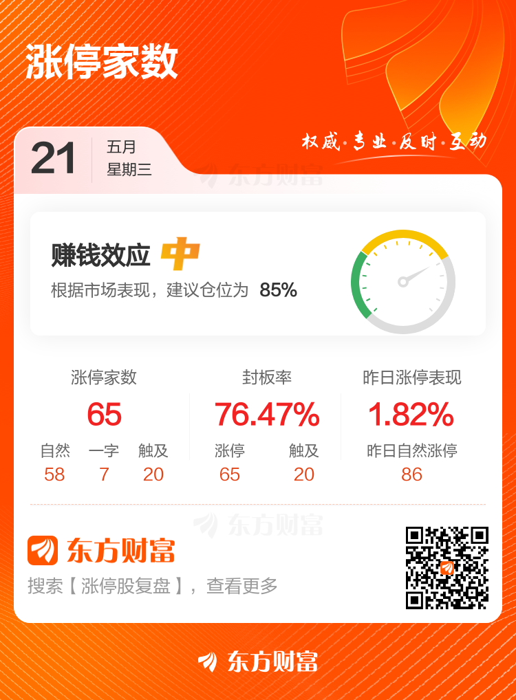 涨停个股数量方面,今日午盘共计65股涨停,另有20只个股盘中一度触及涨停,封板率76.47%。