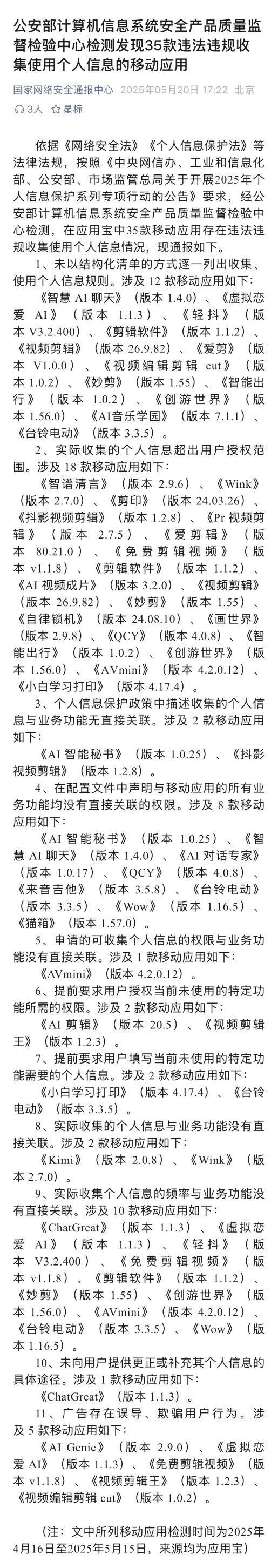 5月20日,国家网络安全通报中心发布公告,依据《网络安全法》《个人信息保护法》等法律法规,按照《中央网信办、工业和信息化部、公安部、市场监管总局关于开展2025年个人信息保护系列专项行动的公告》要求,经公安部计算机信息系统安全产品质量监督检验中心检测,在应用宝中35款移动应用存在违法违规收集使用个人信息情况。