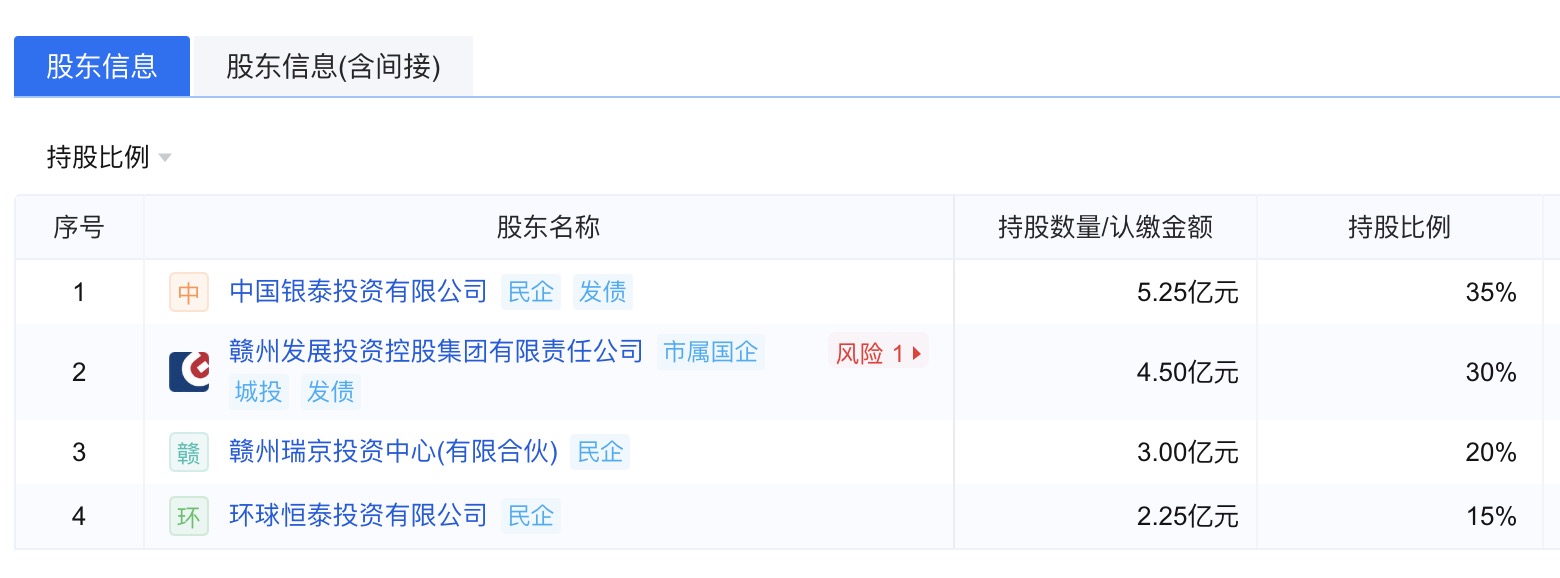 这家成立于2018年的资产管理公司,是一家民营控股、国有参股的混合所有制企业。从股权结构来看,银泰集团作为第一大股东持股35%,江西国资旗下的赣州发展投资控股集团持股30%,赣州瑞京投资中心(有限合伙)持股17%,剩余15%股份由环球恒泰投资有限公司持有。