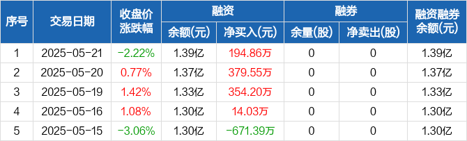 融资方面,当日融资买入1780.97万元,融资偿还1586.11万元,融资净买入194.86万元,连续4日净买入累计942.64万元。融券方面,融券卖出0股,融券偿还0股,融券余量0股,融券余额0元。融资融券余额合计1.39亿元。