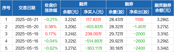 融资方面,当日融资买入895.48万元,融资偿还777.65万元,融资净买入117.83万元。融券方面,融券卖出5000股,融券偿还3900股,融券余量28.43万股,融券余额682.32万元。融资融券余额合计3.28亿元。