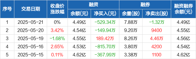 融资方面,当日融资买入824.58万元,融资偿还1353.92万元,融资净偿还529.34万元。融券方面,融券卖出2900股,融券偿还1.61万股,融券余量7.88万股,融券余额71.39万元。融资融券余额合计4.49亿元。