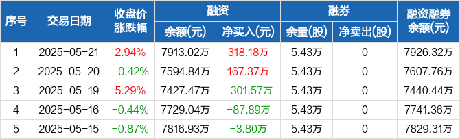 融资方面,当日融资买入825.45万元,融资偿还507.27万元,融资净买入318.18万元。融券方面,融券卖出0股,融券偿还0股,融券余量5.43万股,融券余额13.3万元。融资融券余额合计7926.32万元。
