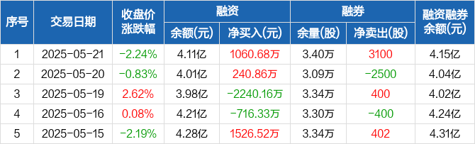 融资方面,当日融资买入3524.71万元,融资偿还2464.03万元,融资净买入1060.68万元。融券方面,融券卖出3800股,融券偿还700股,融券余量3.4万股,融券余额324.89万元。融资融券余额合计4.15亿元。