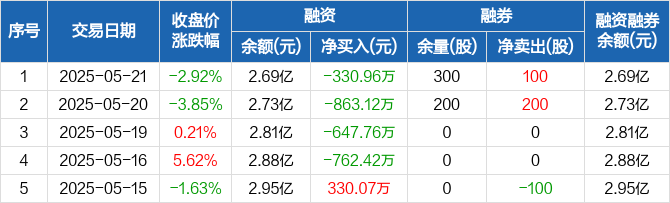 融资方面,当日融资买入3670.31万元,融资偿还4001.27万元,融资净偿还330.96万元,连续4日净偿还累计2604.27万元。融券方面,融券卖出100股,融券偿还0股,融券余量300股,融券余额2691元。融资融券余额合计2.69亿元。
