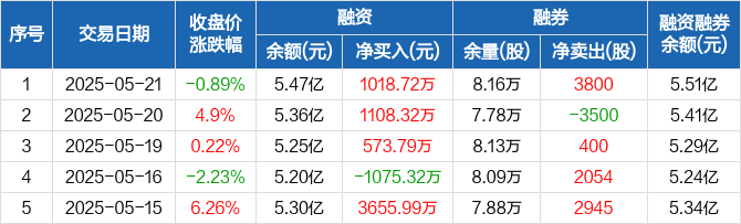 融资方面,当日融资买入4104.48万元,融资偿还3085.76万元,融资净买入1018.72万元,连续3日净买入累计2700.83万元。融券方面,融券卖出3800股,融券偿还0股,融券余量8.16万股,融券余额429.19万元。融资融券余额合计5.51亿元。