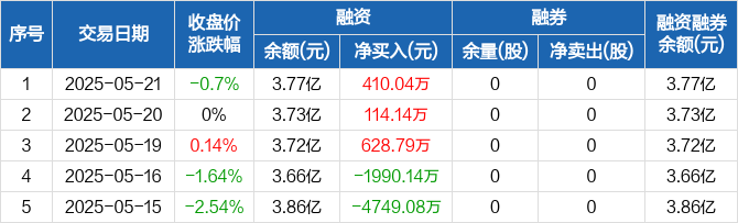 融资方面,当日融资买入4055.97万元,融资偿还3645.93万元,融资净买入410.04万元,连续3日净买入累计1152.97万元。融券方面,融券卖出0股,融券偿还0股,融券余量0股,融券余额0元。融资融券余额合计3.77亿元。