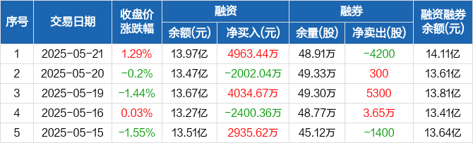 融资方面,当日融资买入1.05亿元,融资偿还5508.24万元,融资净买入4963.44万元。融券方面,融券卖出1800股,融券偿还6000股,融券余量48.91万股,融券余额1456.54万元。融资融券余额合计14.11亿元。
