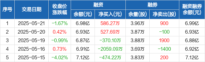 融资方面,当日融资买入3849.7万元,融资偿还3263.43万元,融资净买入586.27万元。融券方面,融券卖出900股,融券偿还0股,融券余量3.96万股,融券余额74.53万元。融资融券余额合计6.99亿元。