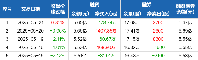 融资方面,当日融资买入2031.76万元,融资偿还2210.5万元,融资净偿还178.74万元。融券方面,融券卖出3500股,融券偿还800股,融券余量17.68万股,融券余额220.65万元。融资融券余额合计5.67亿元。