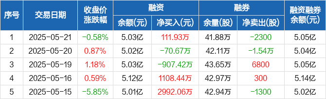 融资方面,当日融资买入1351.12万元,融资偿还1239.19万元,融资净买入111.93万元。融券方面,融券卖出9000股,融券偿还1.13万股,融券余量41.88万股,融券余额144.49万元。融资融券余额合计5.05亿元。
