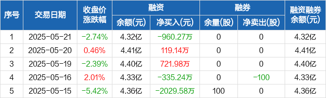 蜂助手融资融券信息显示,2025年5月21日融资净偿还960.27万元;融资余额4.32亿元,较前一日下降2.18%。
