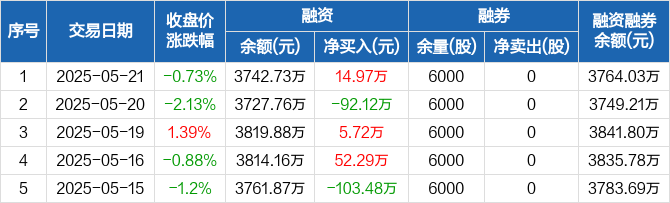 融资方面,当日融资买入555.49万元,融资偿还540.52万元,融资净买入14.97万元。融券方面,融券卖出0股,融券偿还0股,融券余量6000股,融券余额21.3万元。融资融券余额合计3764.03万元。