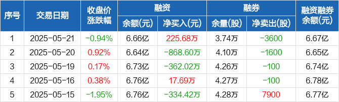 融资方面,当日融资买入1297.2万元,融资偿还1071.52万元,融资净买入225.68万元。融券方面,融券卖出1100股,融券偿还4700股,融券余量3.74万股,融券余额130.15万元。融资融券余额合计6.67亿元。