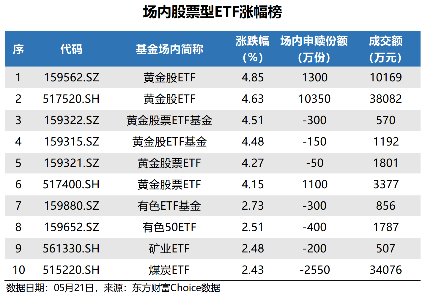 数据显示,昨日场内股票型ETF中,黄金股ETF(159562.SZ)、黄金股ETF(517520.SH)、黄金股票ETF基金涨幅居前。其中,黄金股ETF(159562.SZ)涨幅最大,为4.85%。