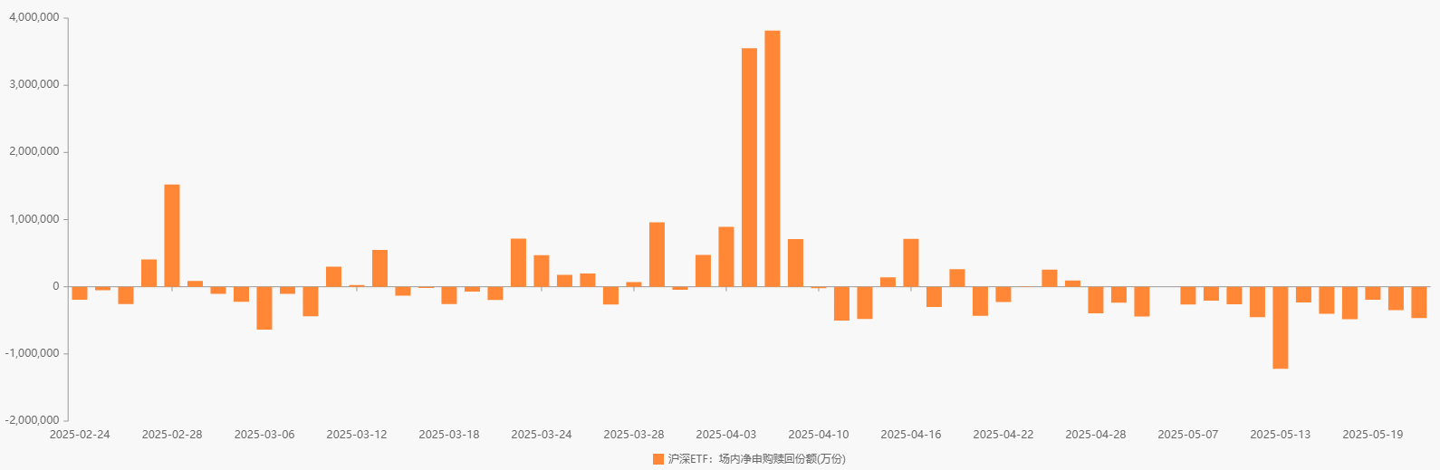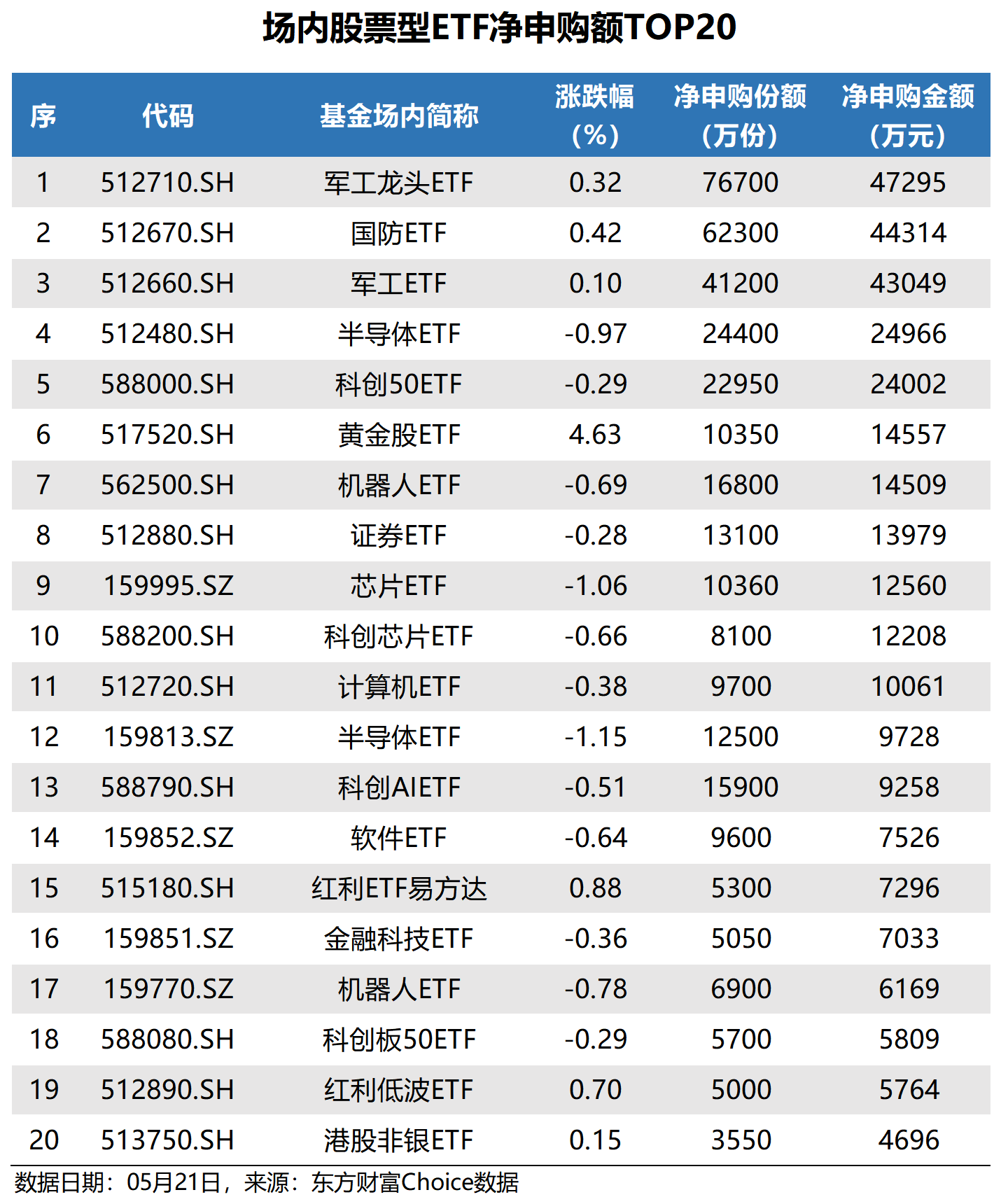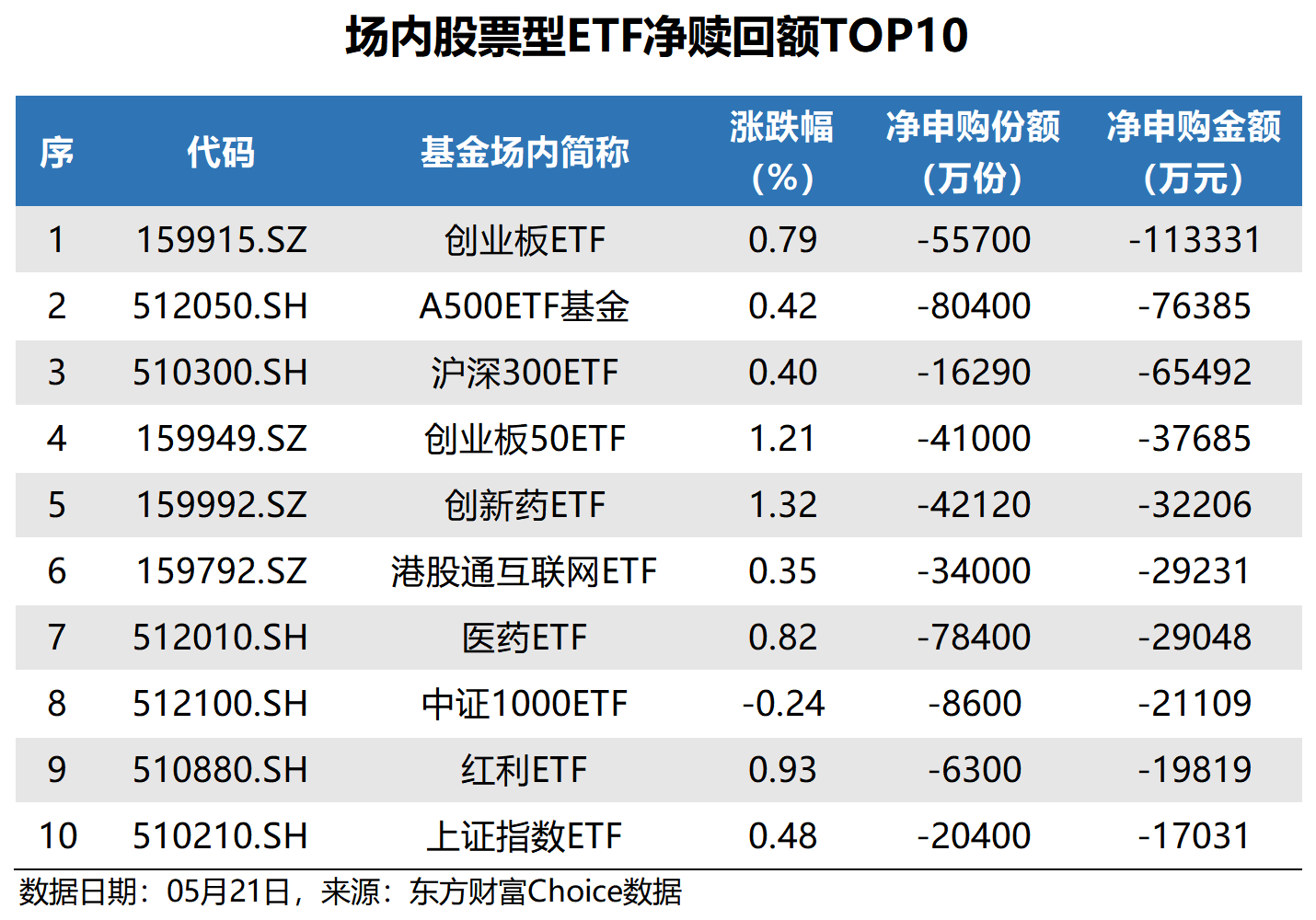 昨日(5月21日),东方财富Choice数据显示,场内股票型ETF净赎回46.62亿份;其中,沪市股票型ETF净赎回17.29亿份,深市股票型ETF净赎回29.33亿份。以最新净值计,昨日市场净赎回53.43亿元。