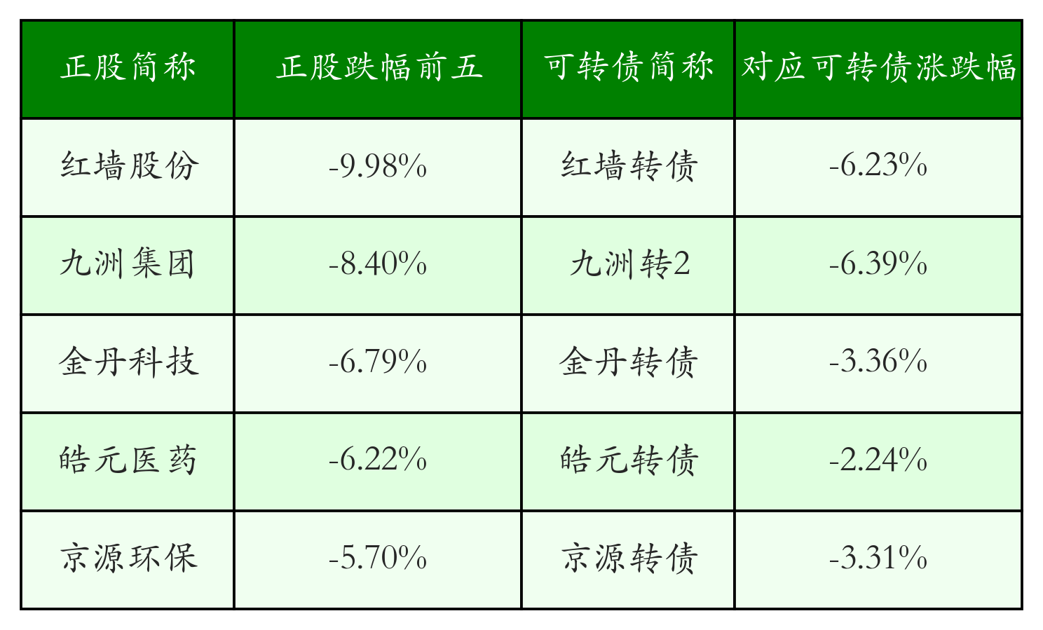 南财智讯5月22日电,南财金融终端盘后数据显示,债市方面,中证转债指数收跌0.32%,报429.67,成交额为503.22亿元。可转债方面,今日共成交471只可转债,其中59只收涨,1只收平,411只收跌。具体来看,5只可转债涨幅超过2%。其中精装转债(127055)涨12.25%,博俊转债(123222)涨6.27%,豪24转债(113690)涨2.16%。今日有24只可转债跌幅超2%,九洲转2(123089)跌6.39%,红墙转债(127094)跌6.23%,天源转债(123213)跌4.63%。存在交易量的可转债所对应的正股中,58只收涨,4只收平,409只收跌。具体来看,2只可转债对应正股涨幅超过5%,其中,中天精装(002989)涨停,收涨10.01%。同时所对应的可转债:精装转债(127055)同涨12.25%。今日有11只可转债对应正股跌幅超过5%,红墙股份(002809)跌停,收跌9.98%。同时所对应的可转债:红墙转债(127094)同跌6.23%。