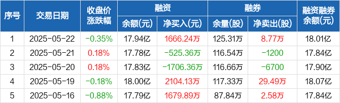 融资方面,当日融资买入3165.93万元,融资偿还1499.69万元,融资净买入1666.24万元。融券方面,融券卖出9万股,融券偿还2300股,融券余量125.31万股,融券余额706.75万元。融资融券余额合计18.01亿元。