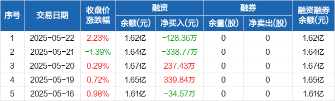 融资方面,当日融资买入1006.88万元,融资偿还1135.24万元,融资净偿还128.36万元。融券方面,融券卖出0股,融券偿还0股,融券余量0股,融券余额0元。融资融券余额合计1.62亿元。