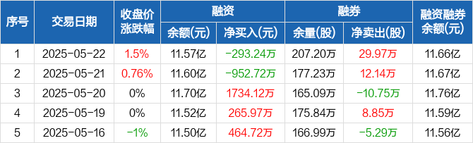 融资方面,当日融资买入5909.36万元,融资偿还6202.61万元,融资净偿还293.24万元。融券方面,融券卖出36.84万股,融券偿还6.87万股,融券余量207.2万股,融券余额839.16万元。融资融券余额合计11.66亿元。