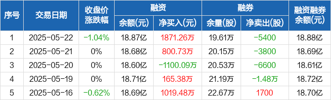 融资方面,当日融资买入3706.43万元,融资偿还1835.16万元,融资净买入1871.26万元。融券方面,融券卖出8500股,融券偿还1.39万股,融券余量19.61万股,融券余额93.53万元。融资融券余额合计18.88亿元。