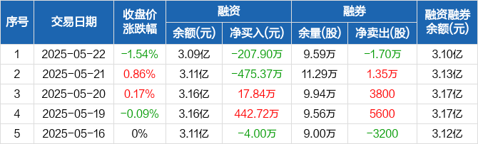 盾安环境融资融券信息显示,2025年5月22日融资净偿还207.9万元;融资余额3.09亿元,较前一日下降0.67%。