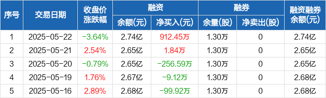 融资方面,当日融资买入3235.84万元,融资偿还2323.39万元,融资净买入912.45万元。融券方面,融券卖出0股,融券偿还0股,融券余量1.3万股,融券余额16.18万元。融资融券余额合计2.74亿元。