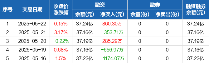 融资方面,当日融资买入2830.08万元,融资偿还1969.78万元,融资净买入860.3万元。融券方面,融券卖出0份,融券偿还0份,融券余量0份,融券余额0元。融资融券余额合计37.24亿元。