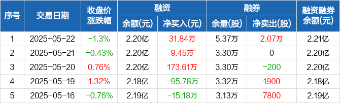 融资方面,当日融资买入308.35万元,融资偿还276.51万元,融资净买入31.84万元,连续3日净买入累计214.9万元。融券方面,融券卖出2.07万股,融券偿还0股,融券余量5.37万股,融券余额48.98万元。融资融券余额合计2.21亿元。