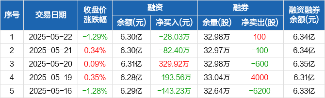 融资方面,当日融资买入704.79万元,融资偿还732.82万元,融资净偿还28.03万元。融券方面,融券卖出100股,融券偿还0股,融券余量32.98万股,融券余额379.27万元。融资融券余额合计6.34亿元。