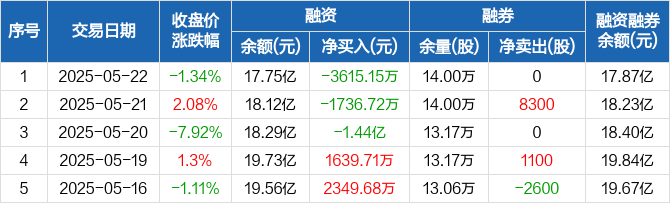 融资方面,当日融资买入4.38亿元,融资偿还4.74亿元,融资净偿还3615.15万元,连续3日净偿还累计1.97亿元。融券方面,融券卖出0股,融券偿还0股,融券余量14万股,融券余额1131.98万元。融资融券余额合计17.87亿元。