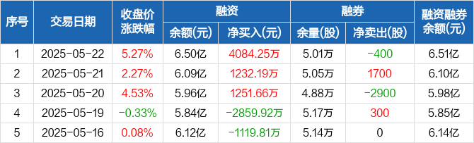 融资方面,当日融资买入1.56亿元,融资偿还1.15亿元,融资净买入4084.25万元,连续3日净买入累计6568.1万元。融券方面,融券卖出300股,融券偿还700股,融券余量5.01万股,融券余额135.18万元。融资融券余额合计6.51亿元。