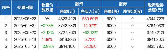融资方面,当日融资买入1178.37万元,融资偿还597.68万元,融资净买入580.69万元。融券方面,融券卖出0股,融券偿还0股,融券余量6000股,融券余额21.3万元。融资融券余额合计4344.72万元。