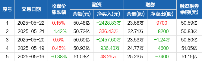 融资方面,当日融资买入5980.77万元,融资偿还8409.6万元,融资净偿还2428.83万元。融券方面,融券卖出2.52万股,融券偿还1.55万股,融券余量23.68万股,融券余额1106.29万元。融资融券余额合计50.59亿元。